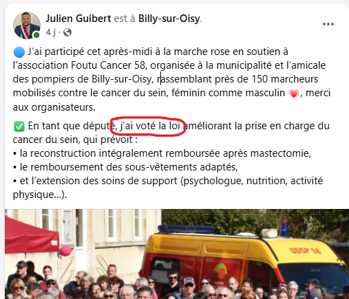 Le 11 octobre dernier, le député RN de la Nièvre, Julien Guibert, participant à un évènement dans le cadre d’octobre rose publie sur ses réseaux « en tant que député, j’ai voté la loi améliorant la prise en charge du cancer du sein ». Nous voulons bien le croire mais il est toujours bon de vérifier les choses par soi-même.